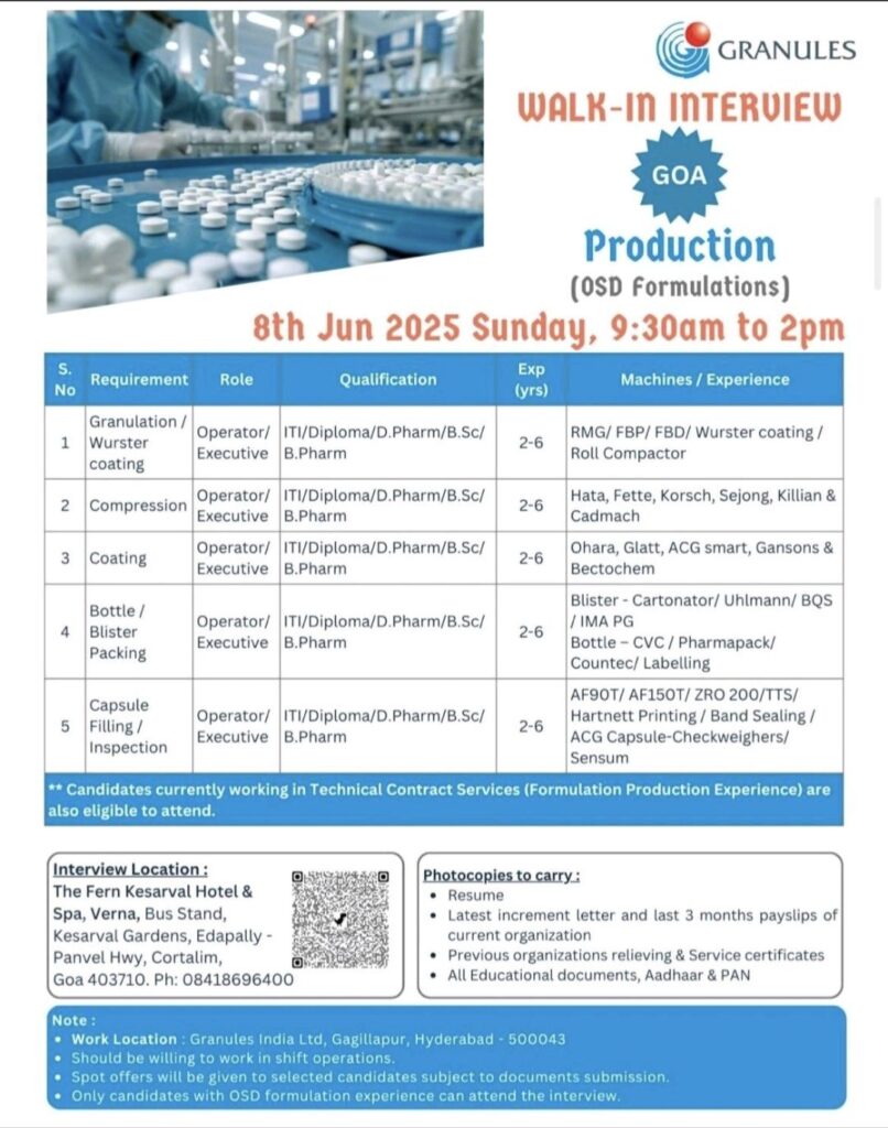 Are you a pharmaceutical professional looking for a new career opportunity? Granules India Ltd., a leading name in the pharmaceutical industry, is conducting a walk-in interview for Operator/Executive roles in Production (OSD Formulations). If you have 2-6 years of experience in oral solid dosage (OSD) manufacturing, this is your chance to join a reputed company with growth opportunities!