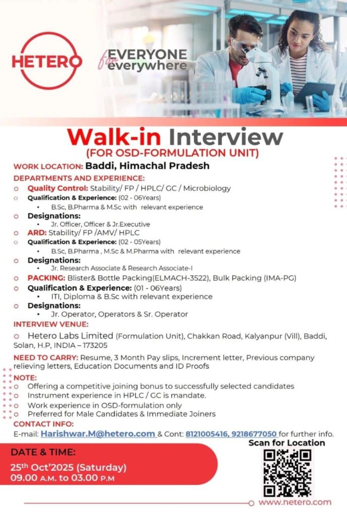 Hetero, a leading pharmaceutical company, is conducting a walk-in interview for experienced professionals in its OSD-Formulation Unit located in Baddi, Himachal Pradesh. This is a prime opportunity for candidates with relevant experience in formulation units to join a dynamic team committed to excellence in pharma manufacturing.