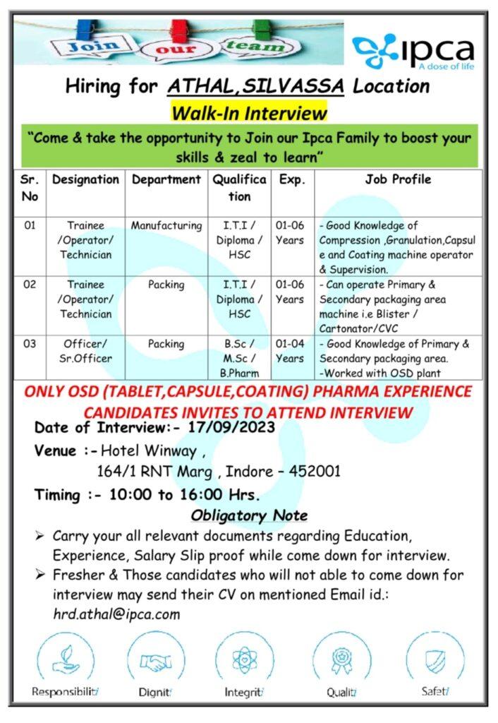 – Fresher & Those candidates who will not able to come down for interview may send their CV on mentioned Email id.: hrd.athal@ipca.com