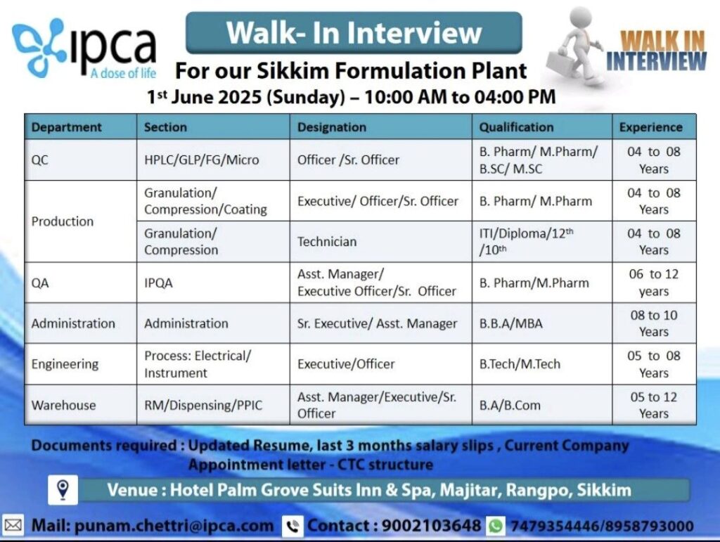 IPCA Laboratories, a leading pharmaceutical company, is conducting a walk-in interview drive for experienced professionals to join its Sikkim Formulation Plant. The event will be held on Sunday, June 1, 2025, from 10:00 AM to 4:00 PM at Hotel Palm Grove Suites Inn & Spa, Majitar, Rangpo, Sikkim.