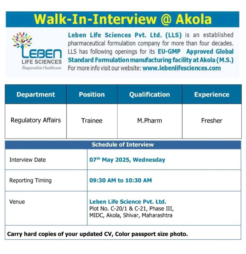 LLS has following openings for its EU-GMP Approved Global Standard Formulation manufacturing facility at Akola (M.S.)