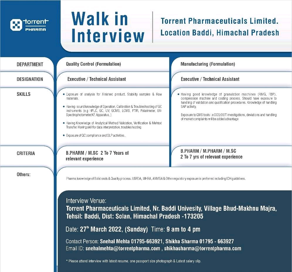 Walk in Interview at Torrent Pharmaceutical Limited, Baddi for QC & Production department on 27th March, 22 (Sunday)