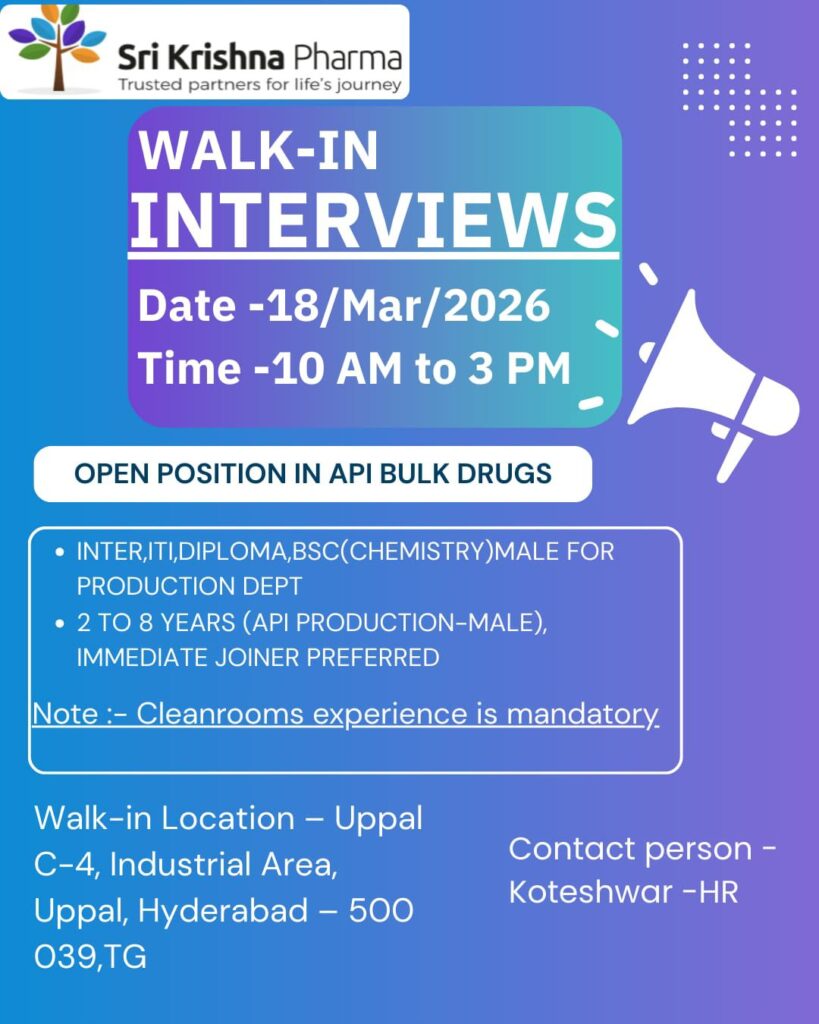 Sri Krishna pharmaceutical company is conducting a Walk-In Interview for the position of API Production Executive / Operator in the API Production Department. This opportunity is ideal for candidates with relevant experience in Active Pharmaceutical Ingredient (API) manufacturing and cleanroom operations who are looking to advance their careers in the pharmaceutical industry.