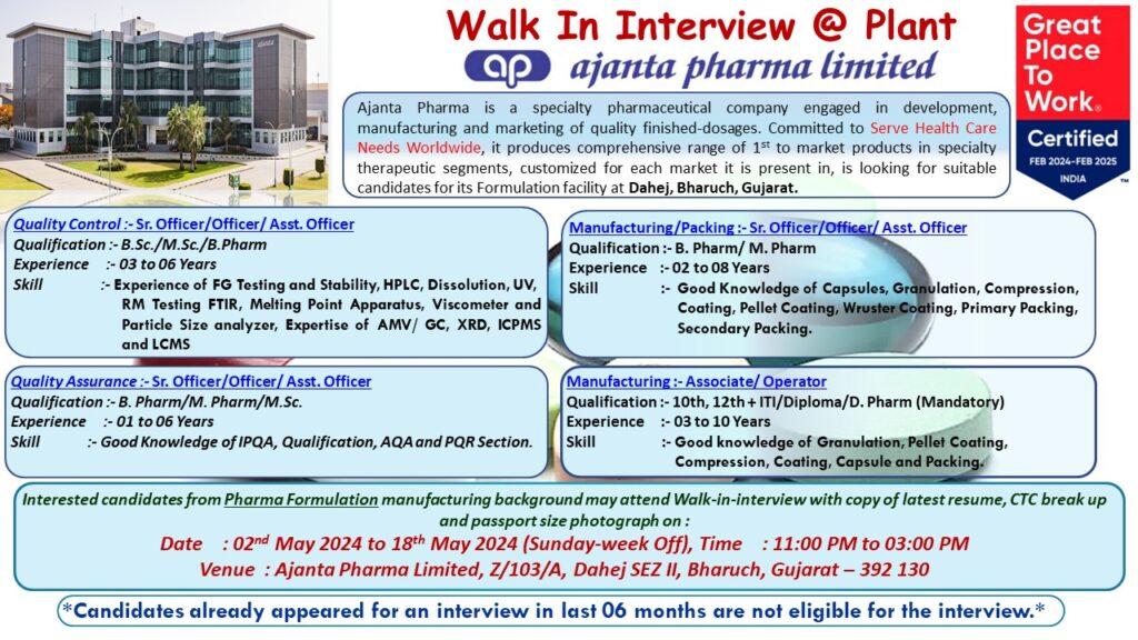 Ajanta Pharma is a specialty pharmaceutical company engaged in development manufacturing and marketing of quality finished-dosages. Committed to Serve Health Care Needs Worldwide, it produces comprehensive range of 1st to market products in specialty therapeutic segments, customized for each market it is present in, is looking for suitable candidates for its Formulation facility at Dahej, Bharuch, Gujarat.