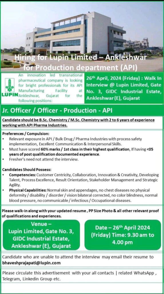 26th April, 2024 (Friday): Walk In Interview @ Lupin Limited, Gate at No. 3, GIDC Industrial Estate, Ankleshwar (E), Gujarat