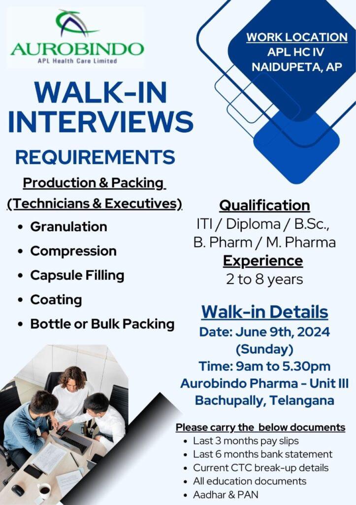 Walk in interview for multiple opening in Production & Packing (Granulation, Compression, Capsule Filling, Coating, Bottle or Bulk Packing) on June 9th, 2024 (Sunday)
