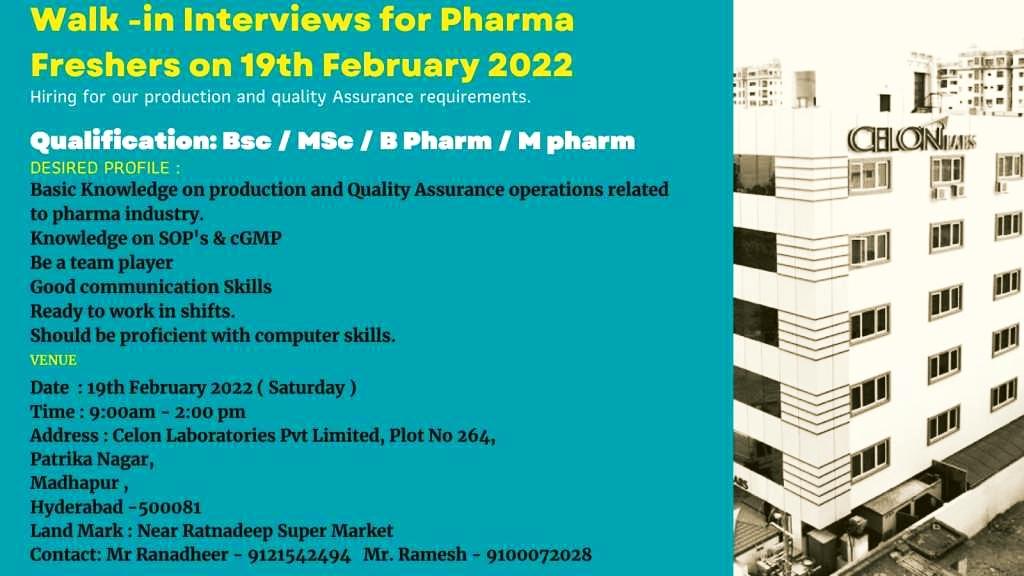 Walk In Interview for Pharma Freshers on 19th February 2022 at Celon Laboratories Private Limited