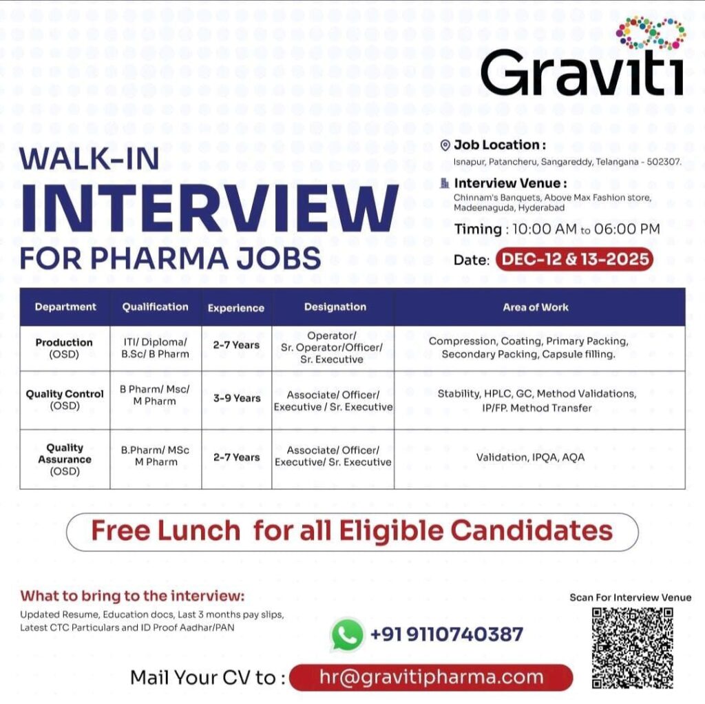Graviti Pharma is hosting a large-scale walk-in interview event for multiple positions across our key departments. If you are an experienced professional in Production, Quality Control (QC), or Quality Assurance (QA), we encourage you to attend!