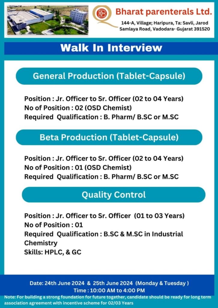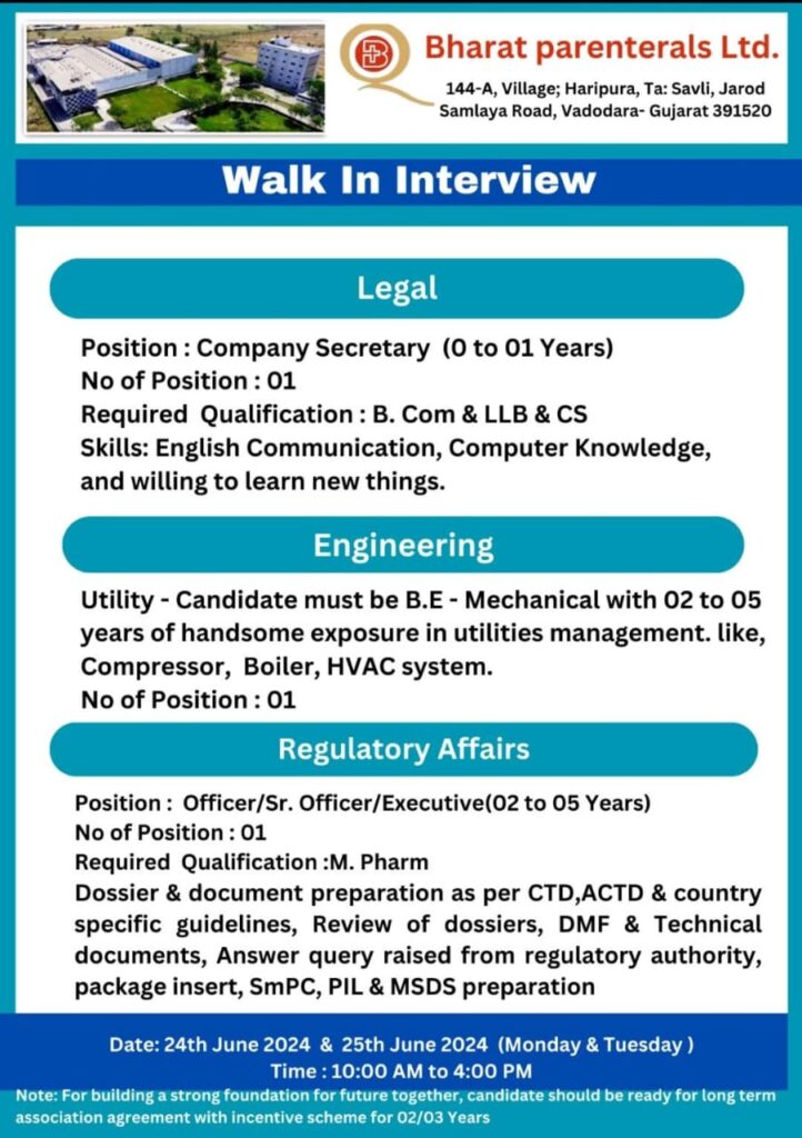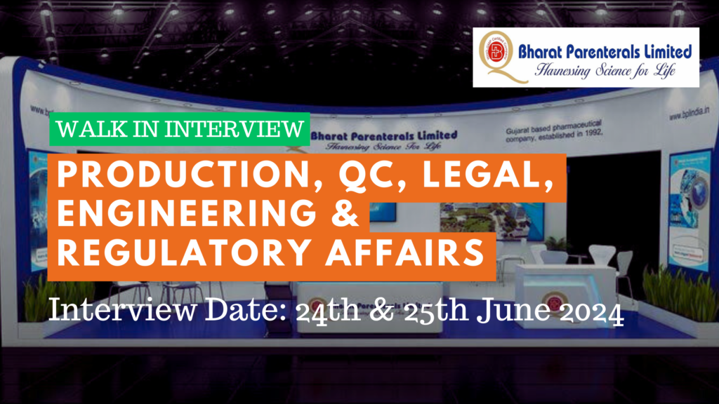Walk In Interview for Production, QC, Legal, Engineering & Regulatory Affairs on 24th & 25th June 2024 at Bharat parenterals Ltd.