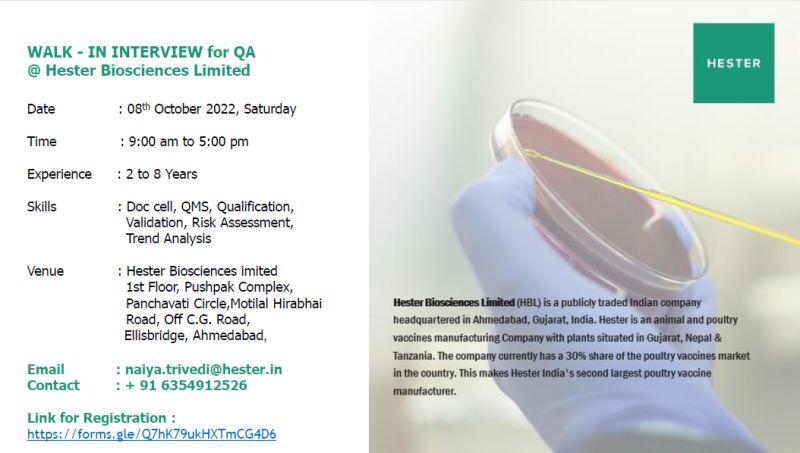 WALK-IN INTERVIEW for QA on 08th October 2022 @Hester Biosciences Limited
