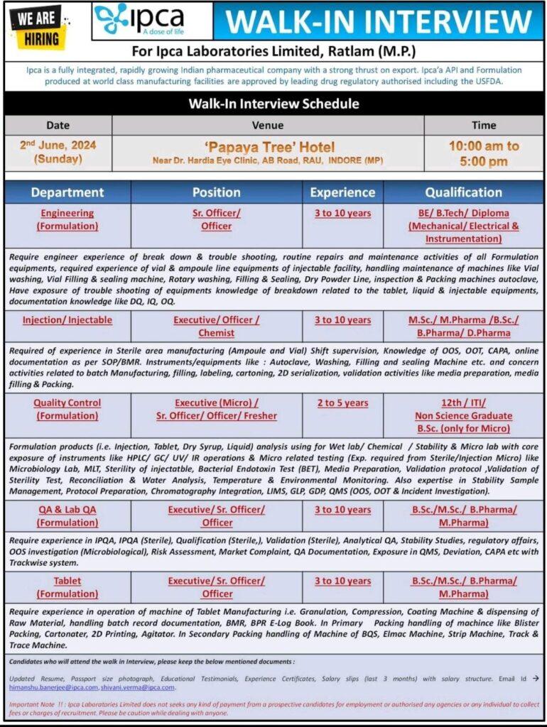 Walk in interview for QA, QC, Engineering, Mfg. (Tablet/ Injection) on 2nd June, 2024 (Sunday) @ Ipca Laboratories Limited