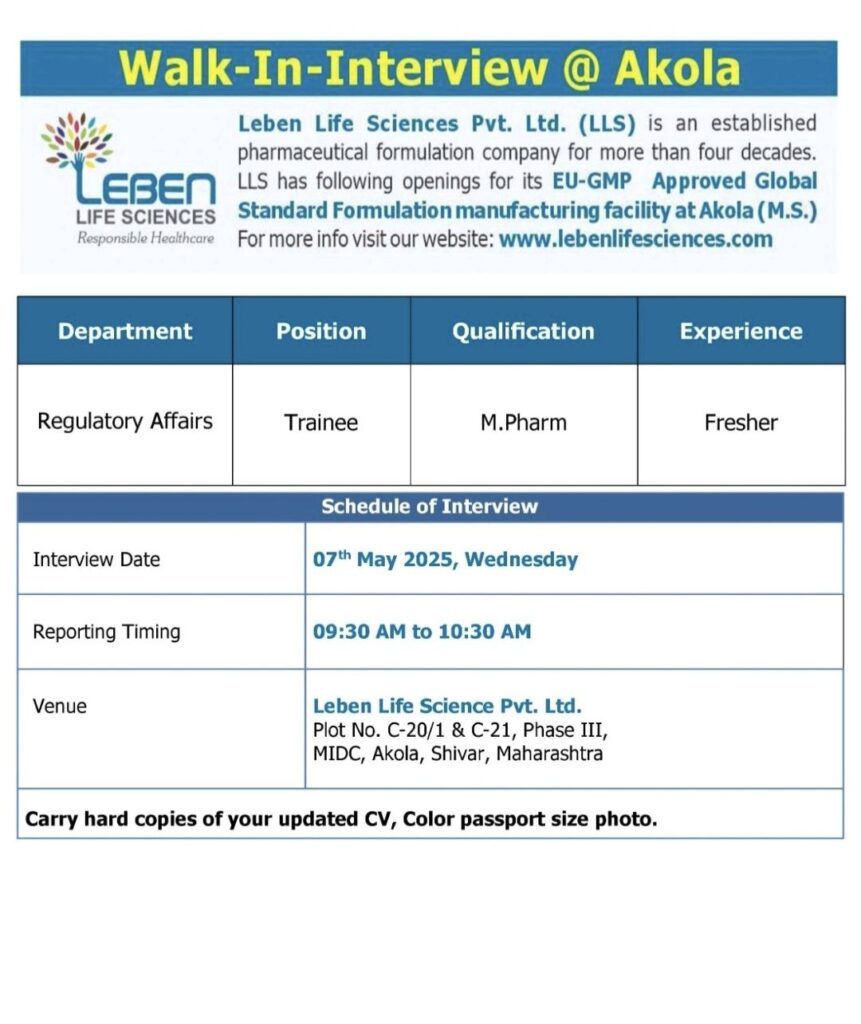 Leben Life Sciences Pvt. Ltd. (LLS), a leading pharmaceutical formulation company with over four decades of industry experience, has announced a walk-in interview for the position of Regulatory Affairs Trainee at its EU-GMP Approved Global Standard manufacturing facility in Akola, Maharashtra.