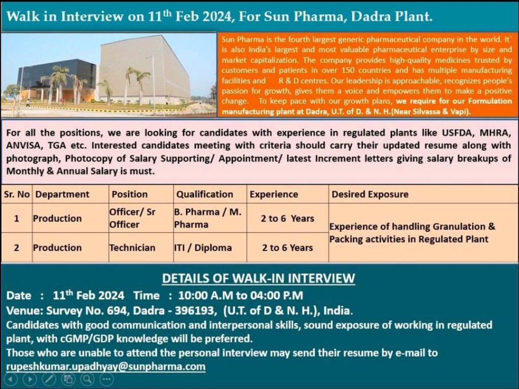 Walk in Interview on 11th Feb 2024, For Sun Pharma, Dadra Plant.
