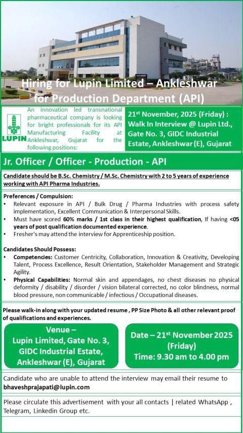 Lupin Limited, an innovative, transnational pharmaceutical company, is hiring bright professionals for its API Manufacturing Facility in Ankleshwar, Gujarat. We are conducting a walk-in interview for the Production Department (API).