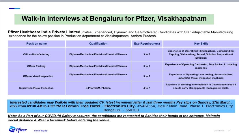Walk-In Interviews at Bengaluru for Pfizer, Visakhapatnam on 27th March, 2022