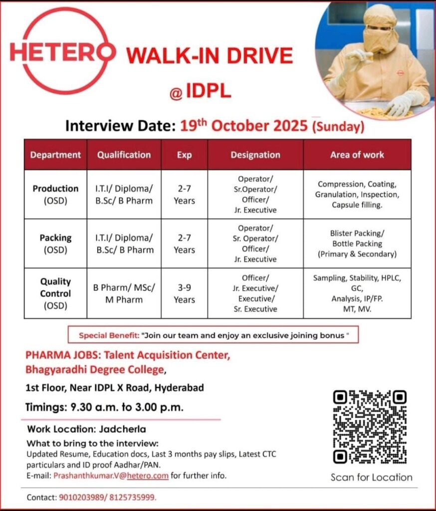 Hetero, a leading name in the pharmaceutical industry, is hosting a walk-in recruitment drive on Sunday, 19th October 2025, at IDPL, Hyderabad. This is a golden opportunity for experienced professionals in Production (OSD), Packing (OSD), and Quality Control (OSD) to join a dynamic team and advance their careers in a world-class manufacturing environment.