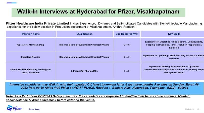 Pfizer Healthcare India, Walk-In Interviews for multiple position in Manufacturing, Packing & Visual Inspection on 06th March 2022
