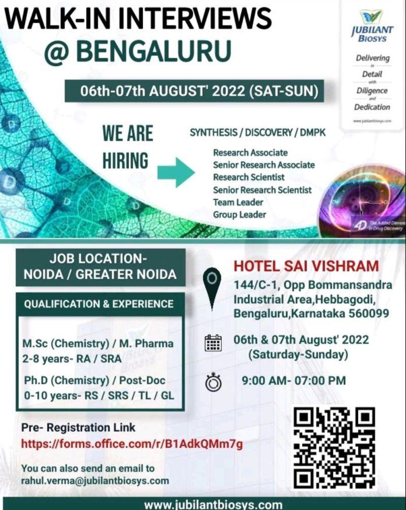 Jubilant Biosys Limited is hiring for Greater Noida site…. If your passion is R&D then plan 6th and 7th at Bengaluru Hotel Sai Vishram….