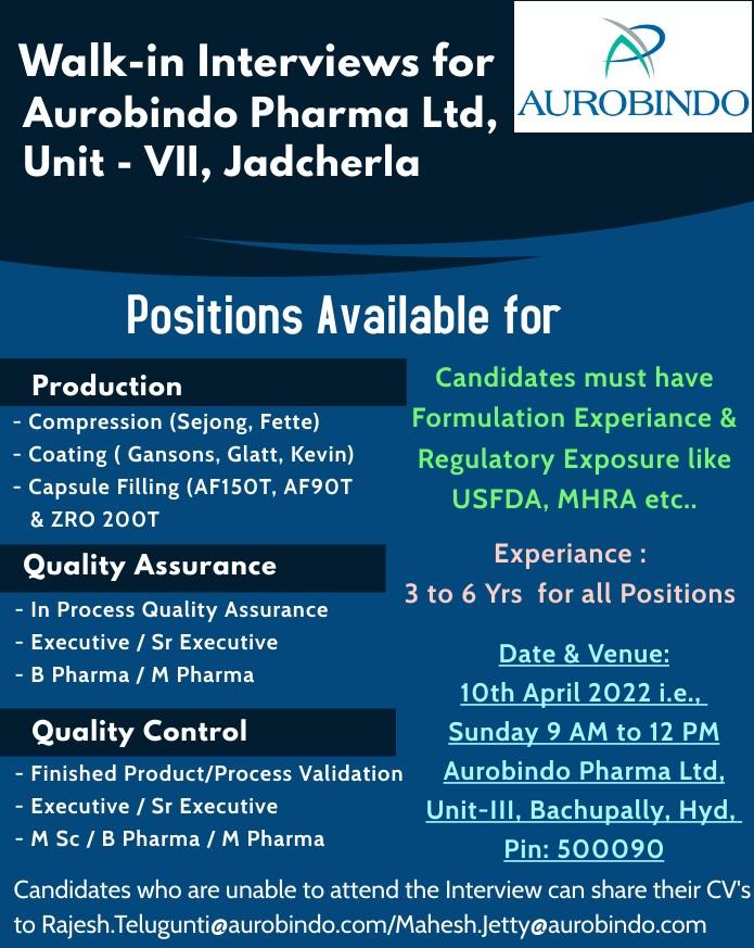 Walk-in Interviews for Aurobindo Pharma Ltd, Unit – VII, Jadcherla on 10th April 2022