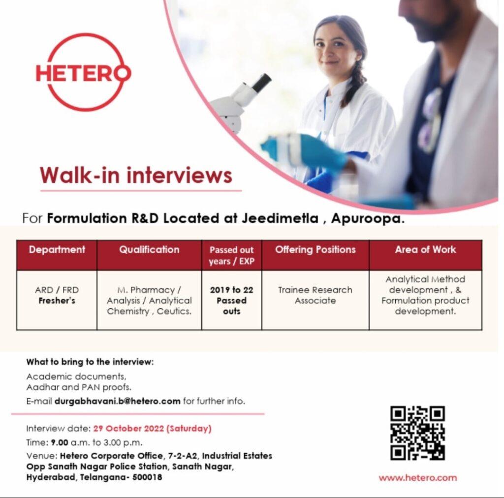 Walk-in interviews for FRESHERS in ARD/ FRD department on 29th October 2022 at Hetero