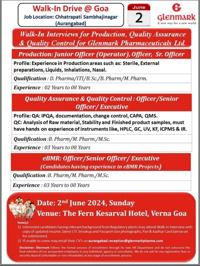 Walk-In Interviews for Production, Quality Assurance & Quality Control for Glenmark Pharmaceuticals Ltd. on 2nd June 2024, Sunday