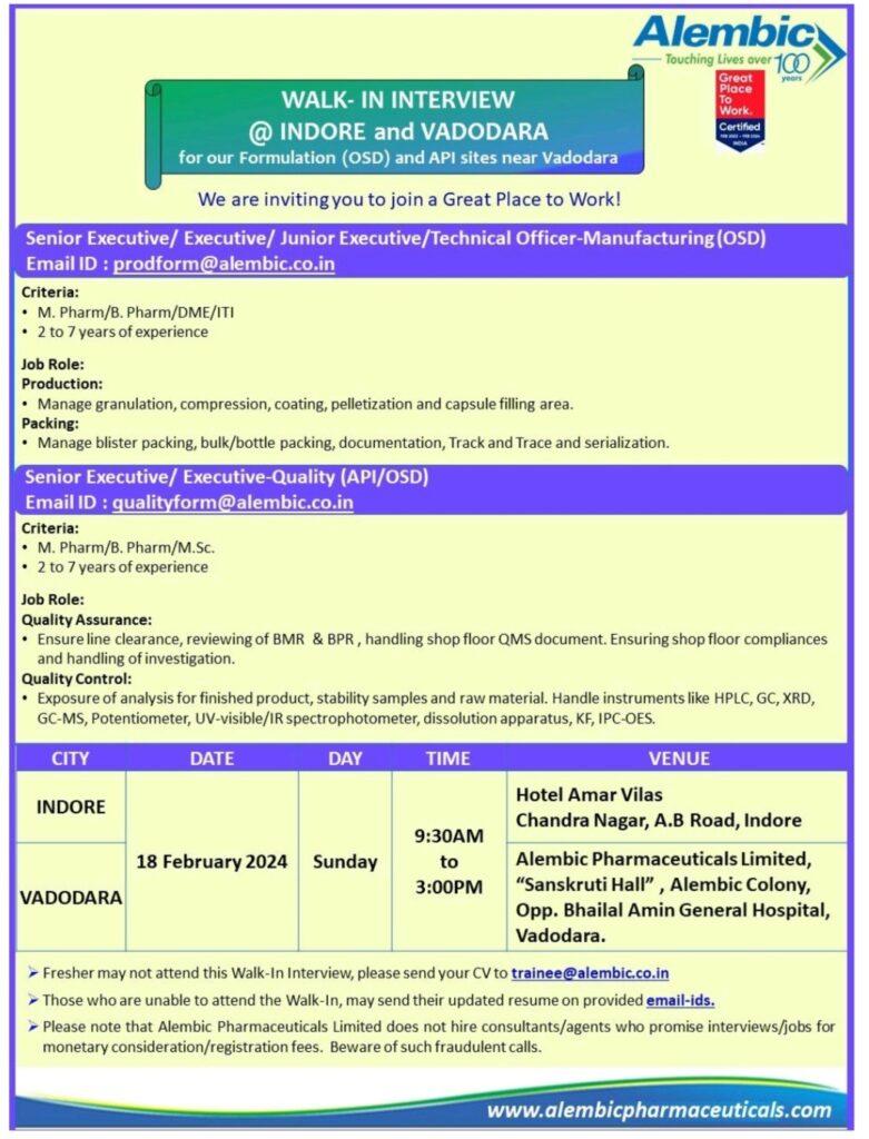 “Walk In Interviews” organised by Alembic Pharmaceutical Limited at “Indore” and “Vadodara” on 18.02.2024(Sunday) for Production (OSD) and Quality (API and OSD)