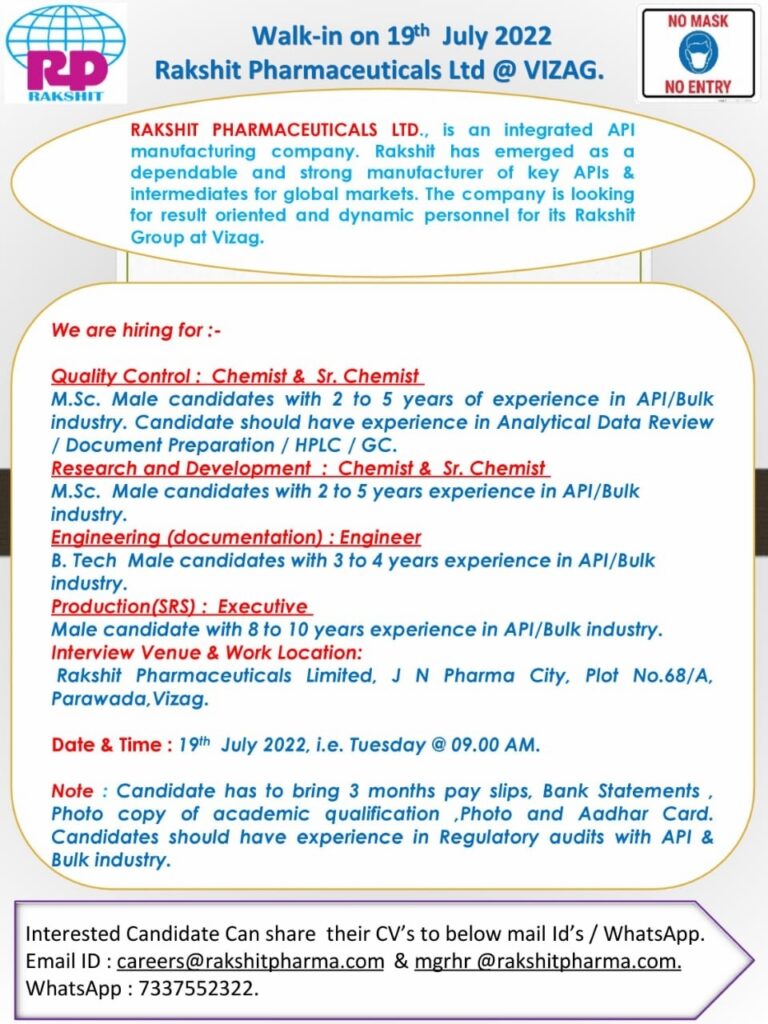 Walk-in on 19th July 2022 Rakshit Pharmaceuticals Ltd @ VIZAG.