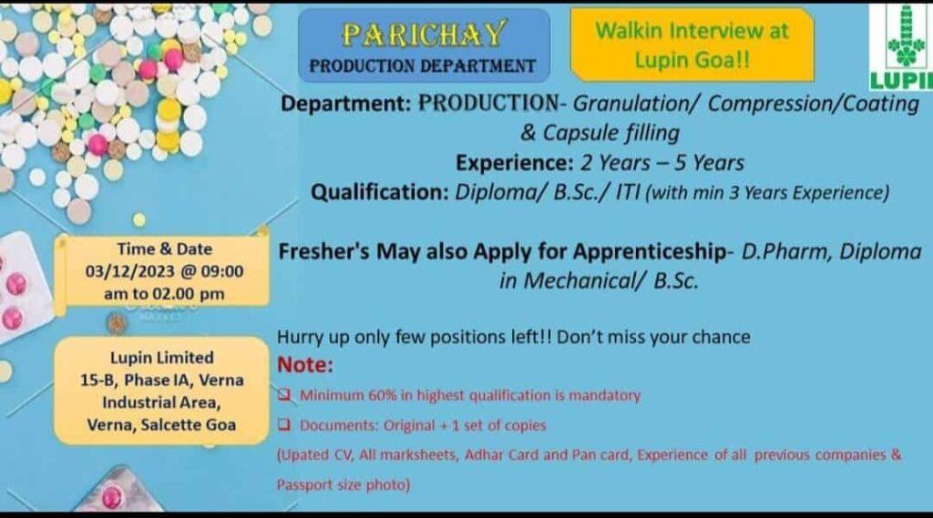 Walkin Interview at Lupin Goa on 03/12/2023, Freshers D.Pharm, Diploma in Mechanical/ B.Sc May also Apply