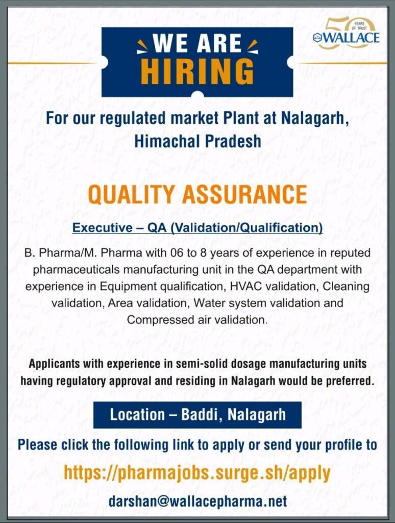 Wallacepharma hiring for Executive – QA (Validation/ Qualification) for regulated market Plant at Nalagarh, Himachal Pradesh