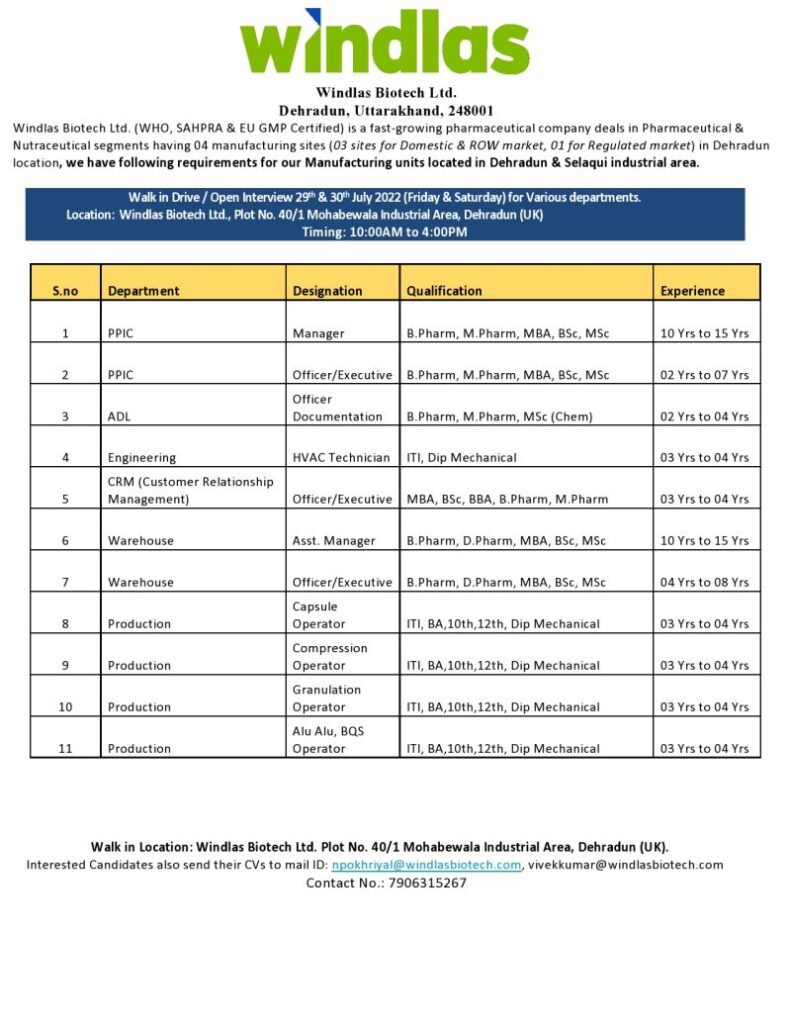 Interested Candidates also send their CVs to mail ID: npokhriyal@windlasbiotech.com, vivekkumar@windlasbiotech.com