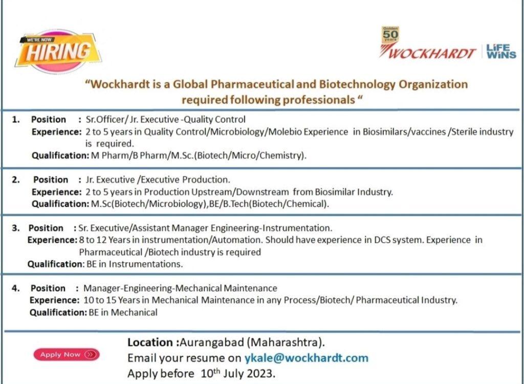 “Wockhardt is a Global Pharmaceutical and Biotechnology Organization required following professionals “