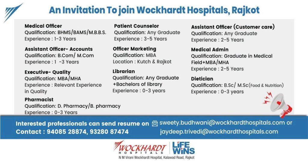 Wockhardt Hospitals, Rajkot is hiring Freshers & Experience D.Pharm, B.Pharm, B.Sc, M.Sc, MBA, MHA, B.Com, M.Com, BHMS, BAMS, MBBS, Any Graduates || Apply Now