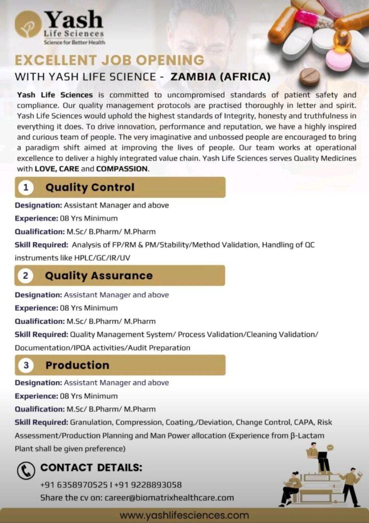 Yash Life Sciences hiring for QC, QA, Production department @ZAMBIA (AFRICA)