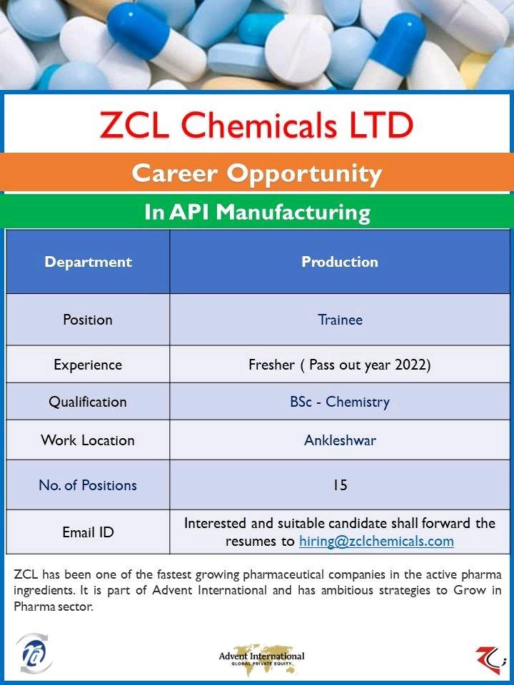 ZCL Chemicals LTD hiring Freshers BSc – Chemistry candidate||15 Positions