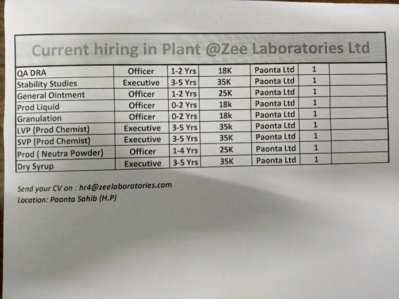 Current hiring in Plant @Zee Laboratories Ltd