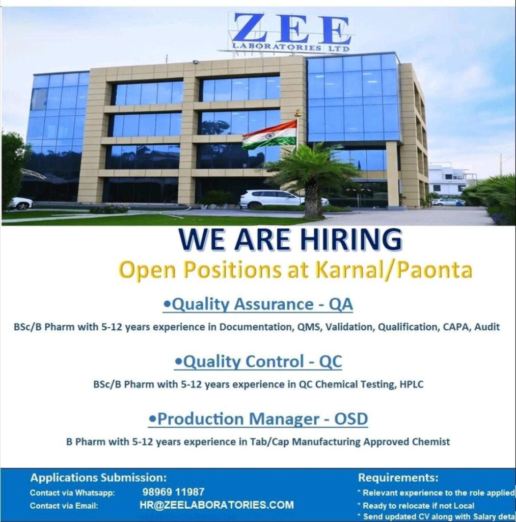 Zee Laboratories Ltd, a reputed name in pharmaceutical manufacturing and research, is expanding its team and inviting skilled professionals to join its facilities located at Karnal and Paonta Sahib. If you are passionate about quality, innovation, and growth in the pharma sector, this is your opportunity to take the next step in your career.