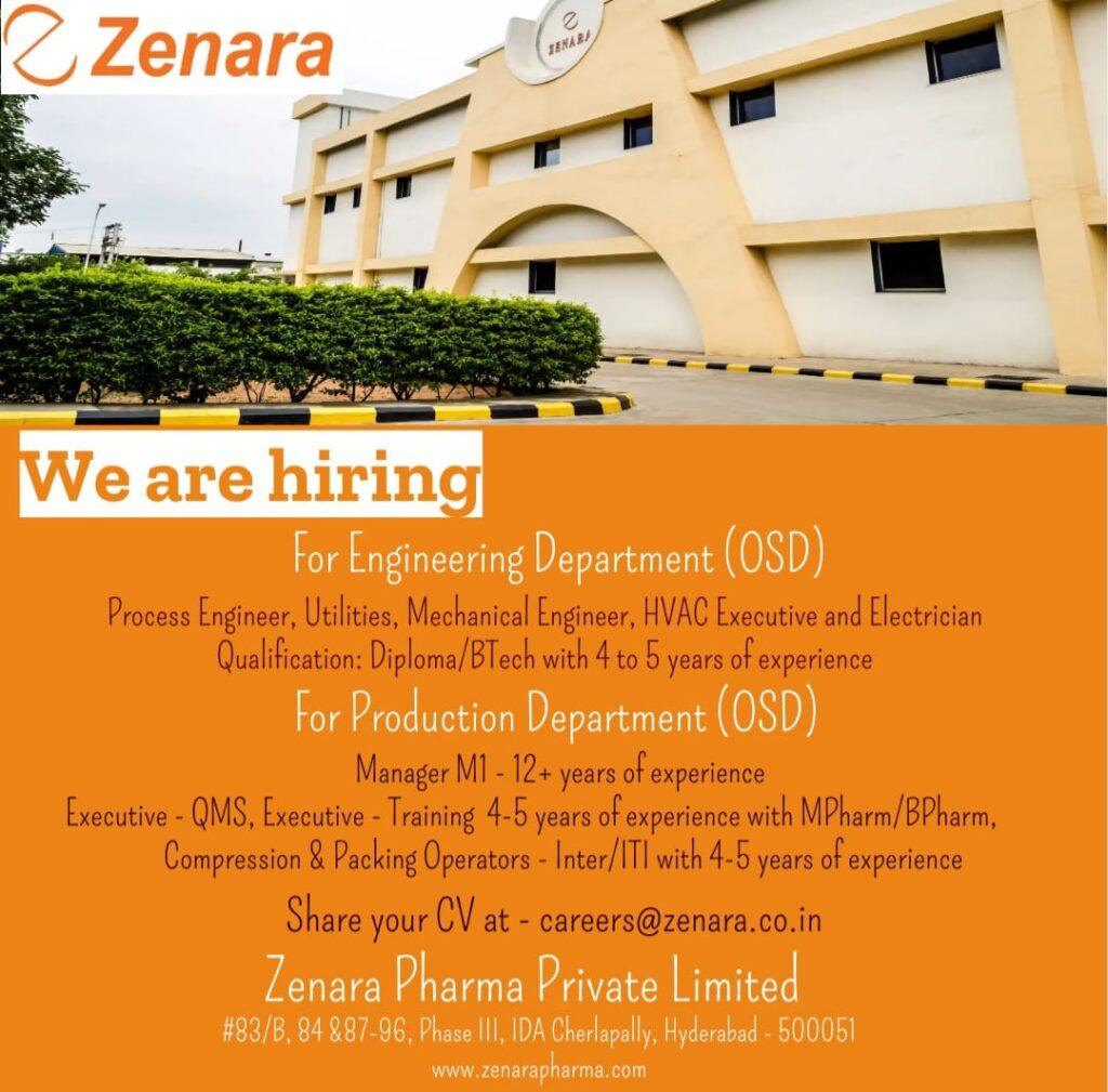 Zenara Pharma Private Limited hiring for OSD Production, Engineering Department