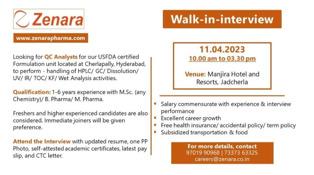 Zenara Pharma- Walk In Interview on 11/04/2023 for USFDA certified Formulation unit located at Cherlapally, Hyderabad