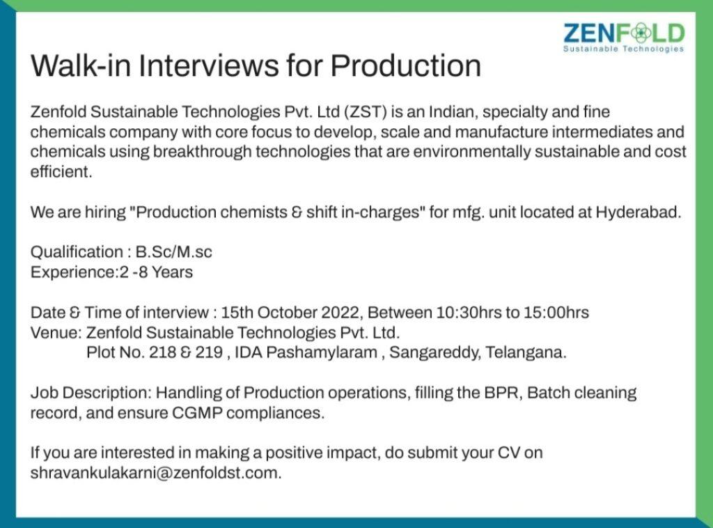 Zenfold Walk In Interview – Production chemists & shift in-charges” for mfg. unit located at Hyderabad on 15th October 2022