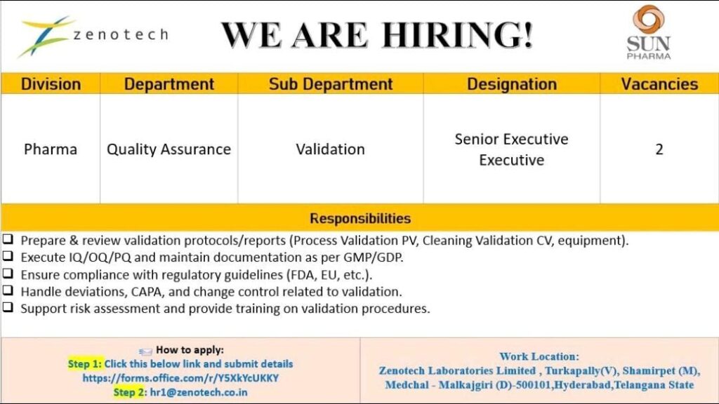 Zenotech Laboratories Ltd., a part of Sun Pharma and a reputed name in the pharmaceutical industry, has announced new job openings in the Quality Assurance (Validation) department. The organization is looking for skilled professionals to join its team at its Hyderabad facility located in Turkapally, Shamirpet, Telangana.