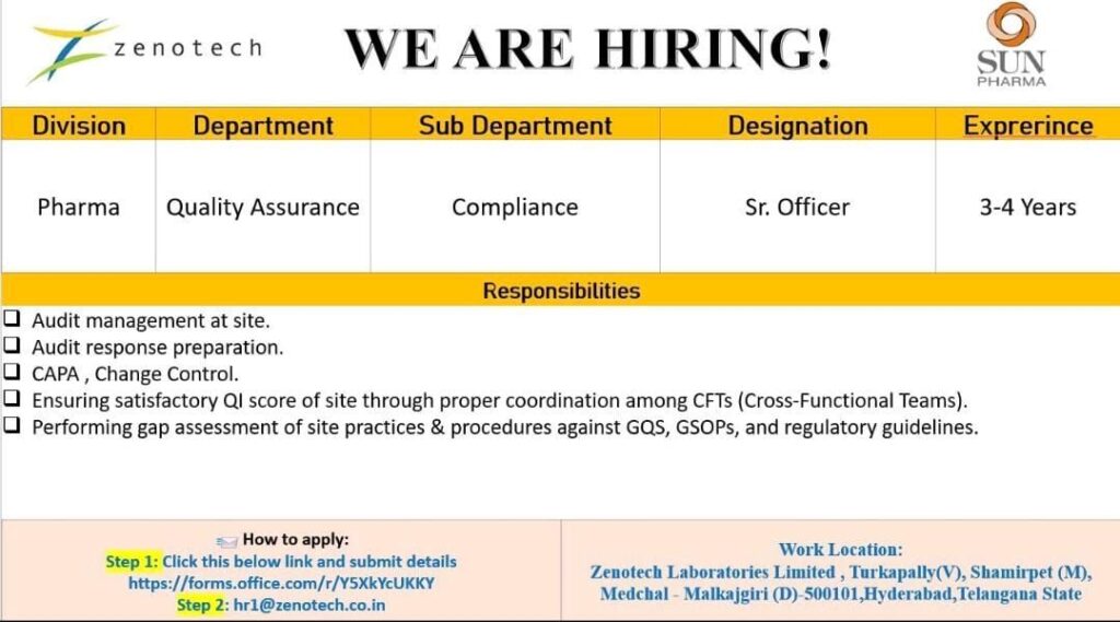 Zenotech Laboratories Limited (A SUN PHARMA Company) is actively hiring for the position of Senior Officer in the Quality Assurance – Compliance department within the Pharma Division. This is an opportunity to join the team in Hyderabad.