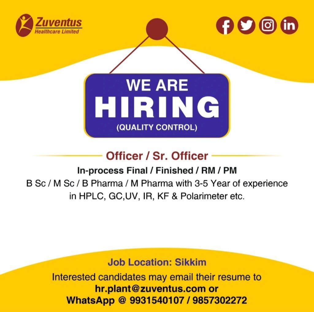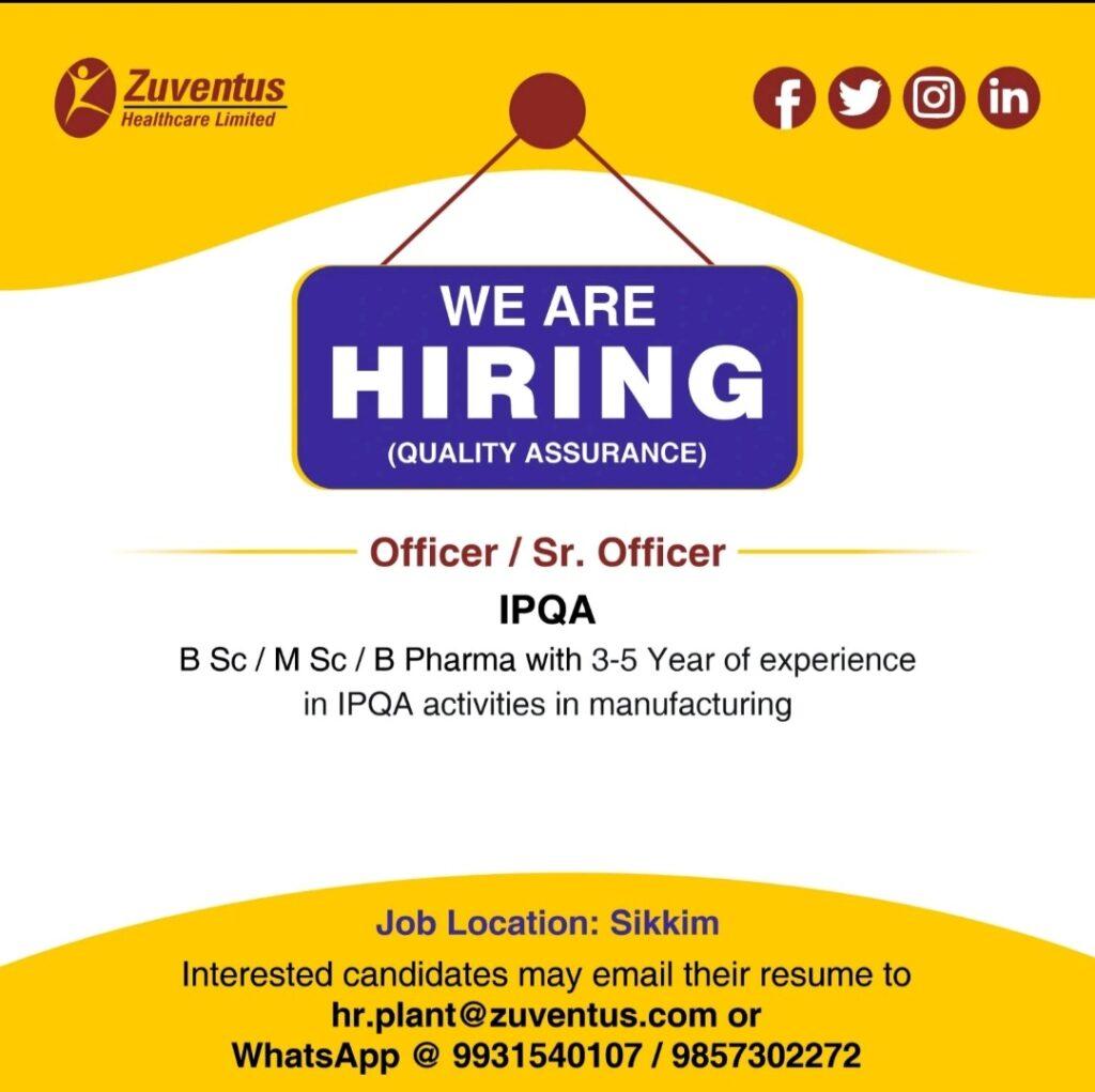 Zuventus Healthcare Limited job vacancy for IPQA, QC & Production department