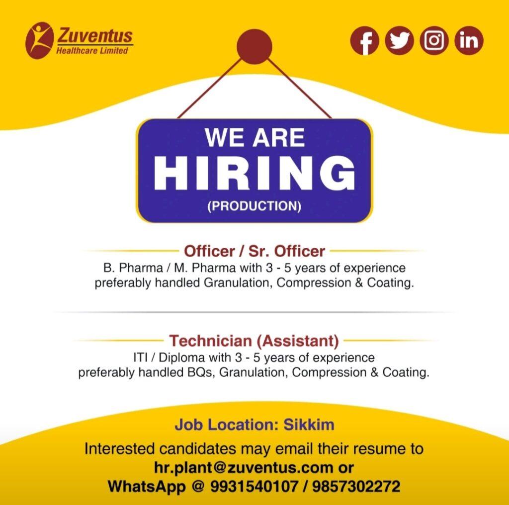 Interested candidates may email their resume to hr.plant@zuventus.com or WhatsApp @ 9931540107/ 9857302272