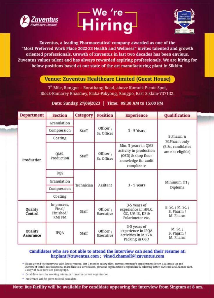 Zuventus Healthcare Limited Walk In Drive on Sunday, 27/08/2023 for Production, Quality Control & Quality Assurance department