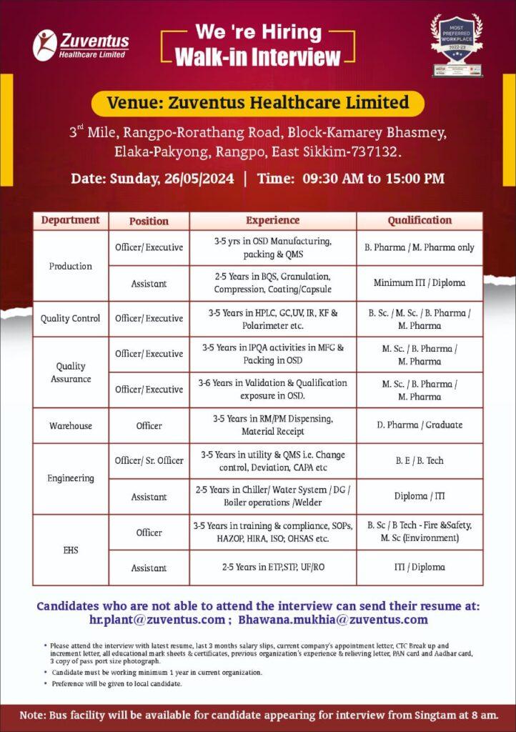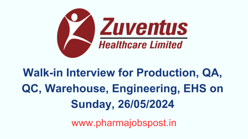 Zuventus Healthcare Walk-in Interview for Production, Quality Control, Quality Assurance, Warehouse, Engineering, EHS on Sunday, 26/05/2024