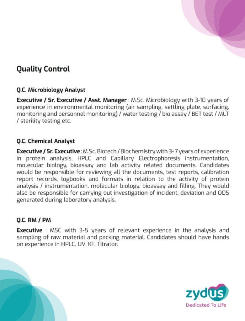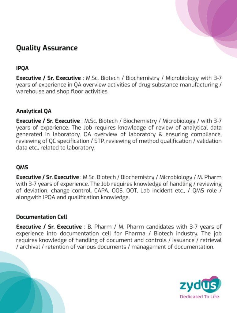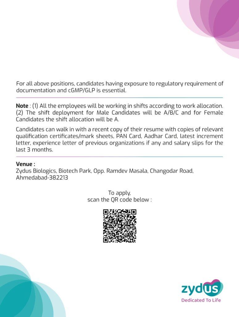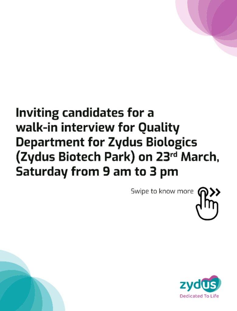 Zydus Biologics walk-in interview for Quality Department on 23rd March, Saturday