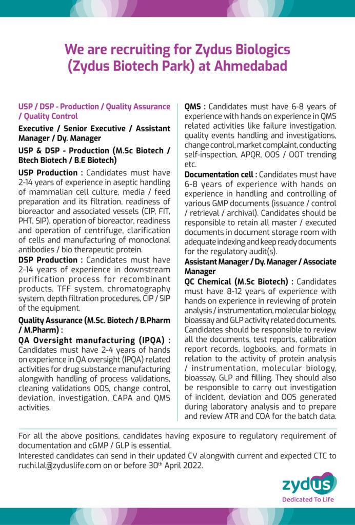 We are recruiting in USP/DSP – Production / Quality Assurance / Quality Control of Zydus Biologics (Zydus Biotech Park) based at Ahmedabad