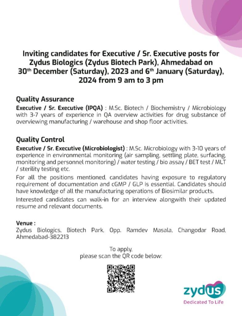 Inviting candidates for Executive / Sr. Executive posts for Zydus Biologics (Zydus Biotech Park), Ahmedabad on 30th December (Saturday), 2023 and 6th January (Saturday), 2024 from 9 am to 3 pm