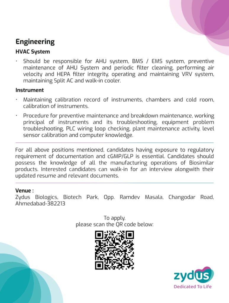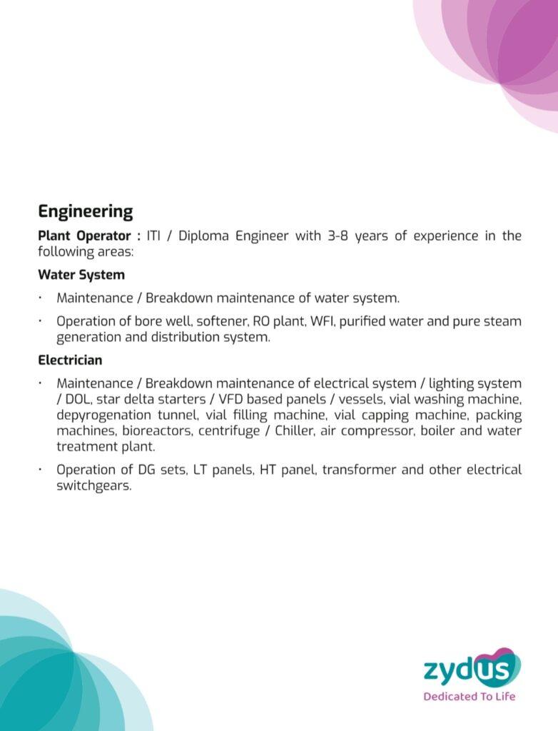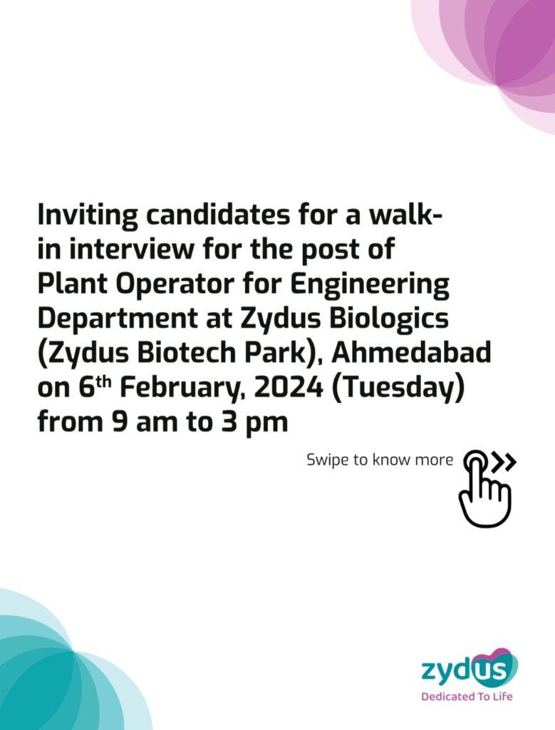 Inviting candidates for a walk- in interview for the post of Plant Operator for Engineering Department at Zydus Biologics (Zydus Biotech Park), Ahmedabad on 6th February, 2024 (Tuesday) from 9 am to 3 pm