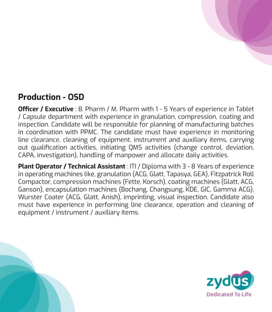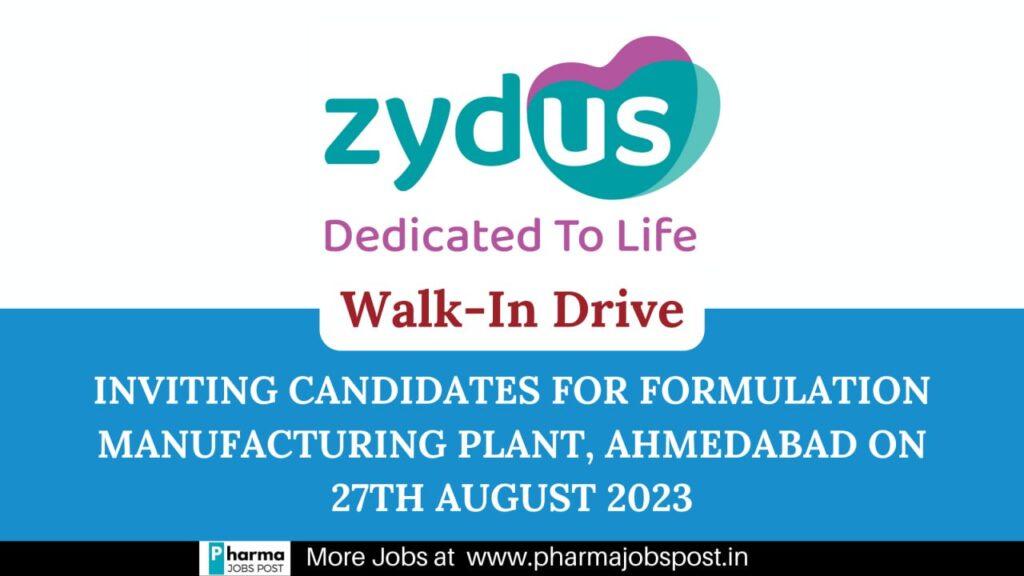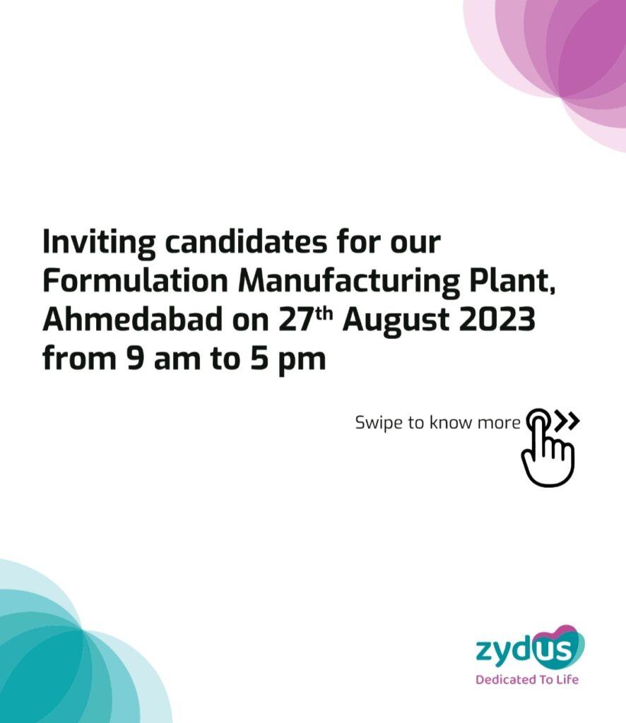 Zydus Group Inviting candidates for Formulation Manufacturing Plant, Ahmedabad on 27th August 2023